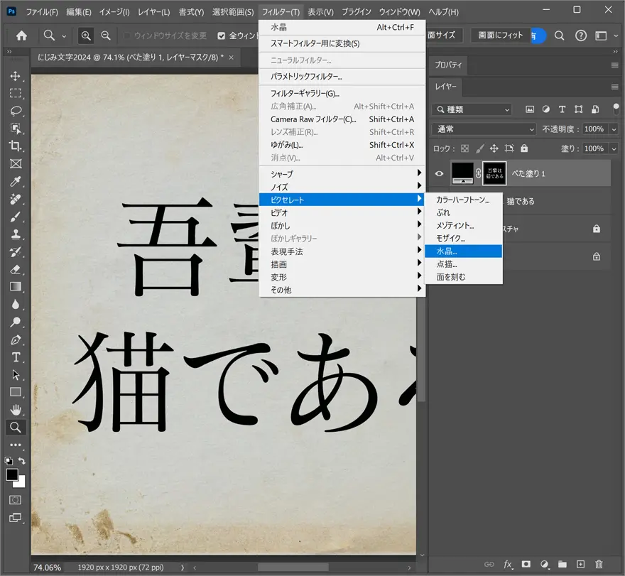 レイヤーパネル上でレイヤーマスクを選択したら、メインメニューより「フィルタ」>「ピクセレート」>「水晶…」をふたたび選択します。
