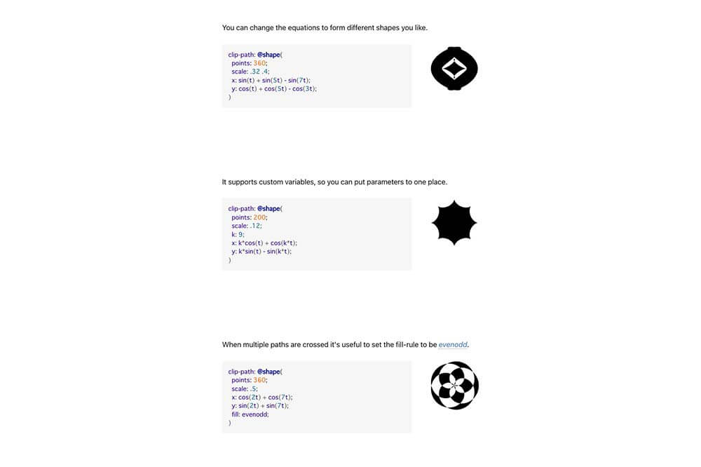 五角形にはじまり、図形の回転やサイズ縮尺から、@shapeをつかったより複雑な図形の描き方などを、ソースコードと一緒にまとめて公開している Polygon Shapes。