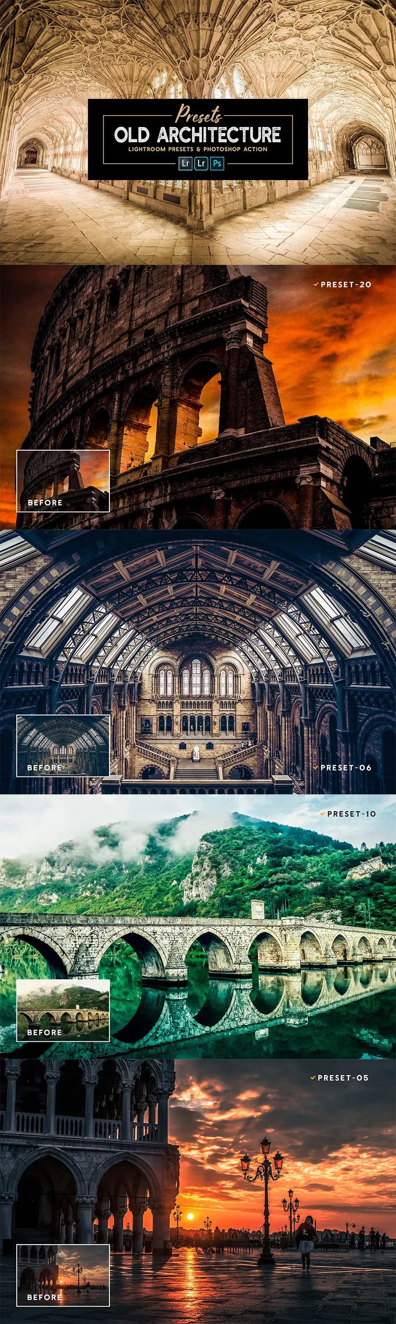 古い建築物やインテリアを魅力的にする、特別な30のPhotoshopアクションと、Lightroomプリセットがどちらも揃ったお得な素材集。