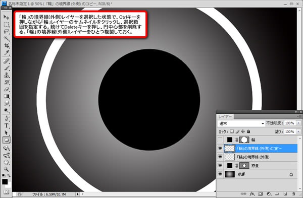 作成した「輪」レイヤーを選択し、メインメニューより「レイヤー」>「レイヤースタイル」>「境界線」を適用します。