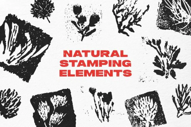 自然の植物モチーフをハンドプリント風に仕上げたスタンプ素材セットです。インクを紙に押し付けたような不完全さがリアル。