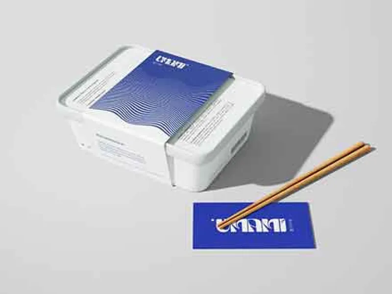 お箸と名刺が添えられた、シンプルでかわいいパッケージ用モックアップ。お好みの画像やロゴを用意し、配置するだけ完成のお手軽アイテム。