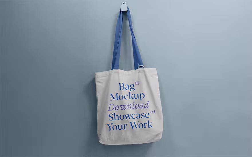 壁に掛けられ、本物そっくりの陰影まで表現できるトートバッグ用モックアップ。スマートオブジェクト機能で、ロゴを放り込むだけで完成。