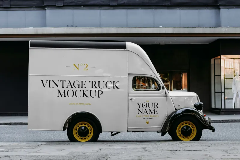 クラシックな見た目がかわいいミニトラックを自由にラッピングできる、超リアルなモックアップ素材。プレゼン資料にいかが?