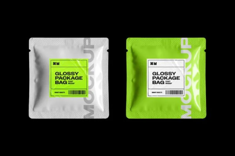 クラフト紙風のパウチをリアルに再現したモックアップ。ミニマルな構図に加え、ロゴやラベル位置を試せるステッカーレイヤー付き。